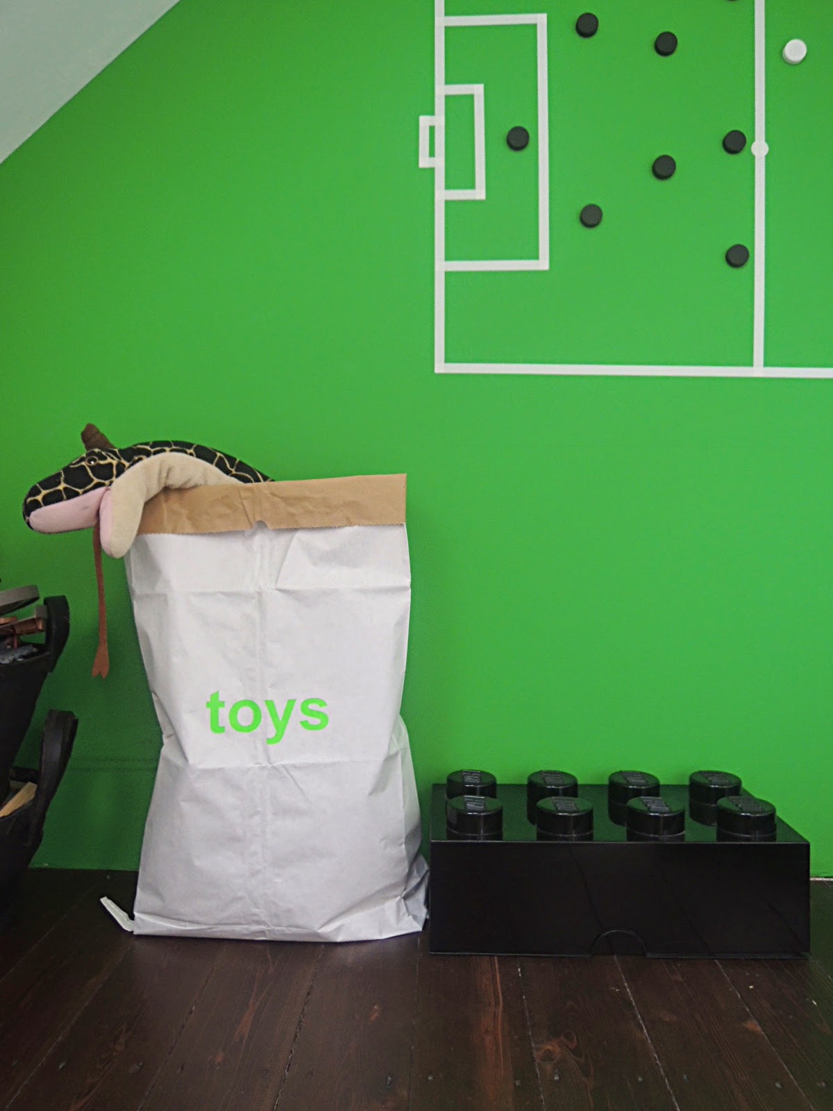 Last february we moved to our new home and I styled Floor’s first room. Moving his favorites like his Schleich-animals, Wolf-bedding and lego storage box. And adding a football green wall. Preparing to paint a small desk football green too ๐