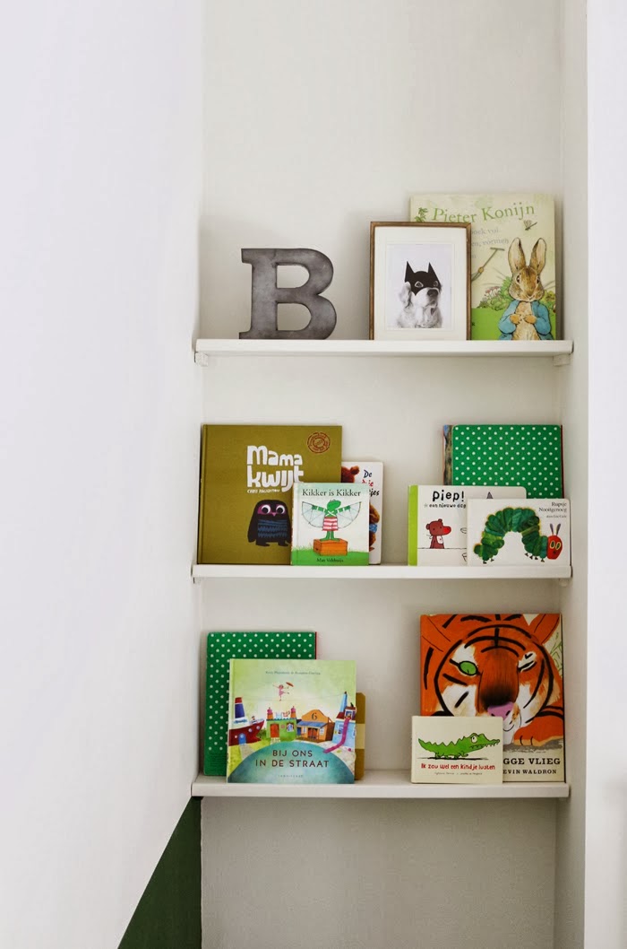 Some details of a kidsroom with such a great combination of white, wood and green. Designed by Maaike Koster for her own son. Maaike is the owner of My Deer, designing concepts, brands and interiors.